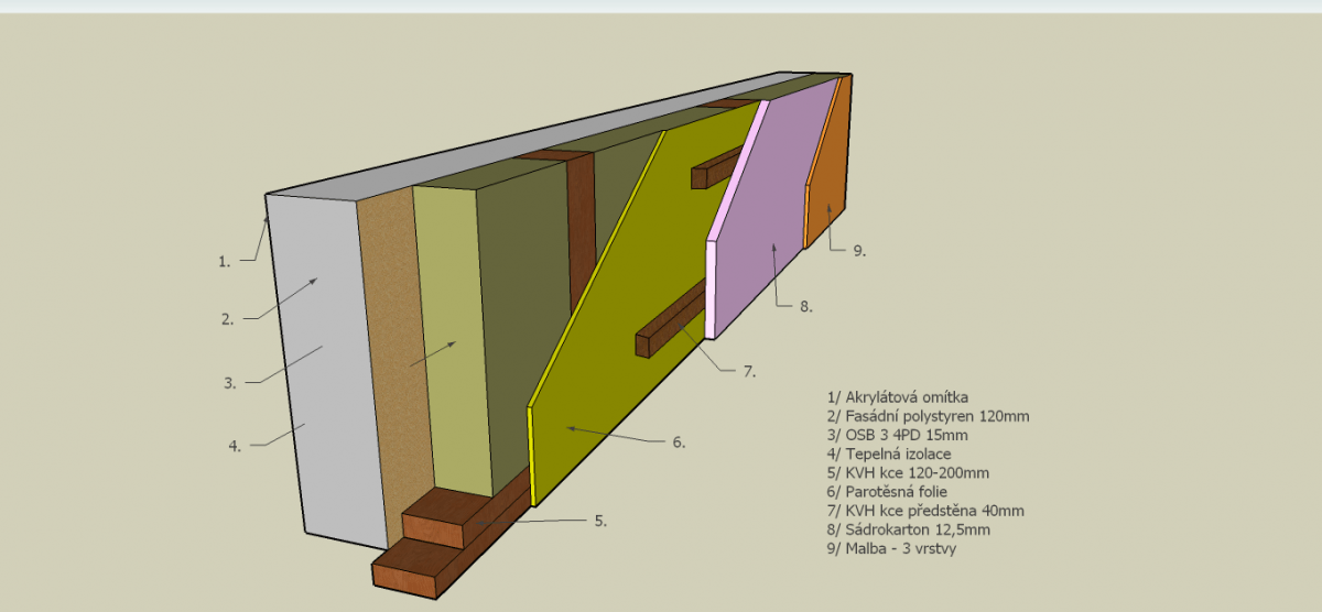 Nosné stěny přenášejí kromě svojí vlastní hmotnosti také veškeré zatížení, které působí na stěnu. Hlavním nosnýmprvkem svislého zatížení jsou konstrukční dřevěné KVH hranoly pravidelně rozmístěné po obvodu mezi které je vkládána tepelná izolace. Vnitřní opláštění na tzv. předstěně se provádí sádrovláknitými deskami Fermacell nebo SDK, které roznáší veškeré vodorovné zatížení. Z vnější strany obvodové stěny je instalována konstrukční OSB deska na kterou je realizován zateplovací systém pro dosažení nižší spotřeby tepla.