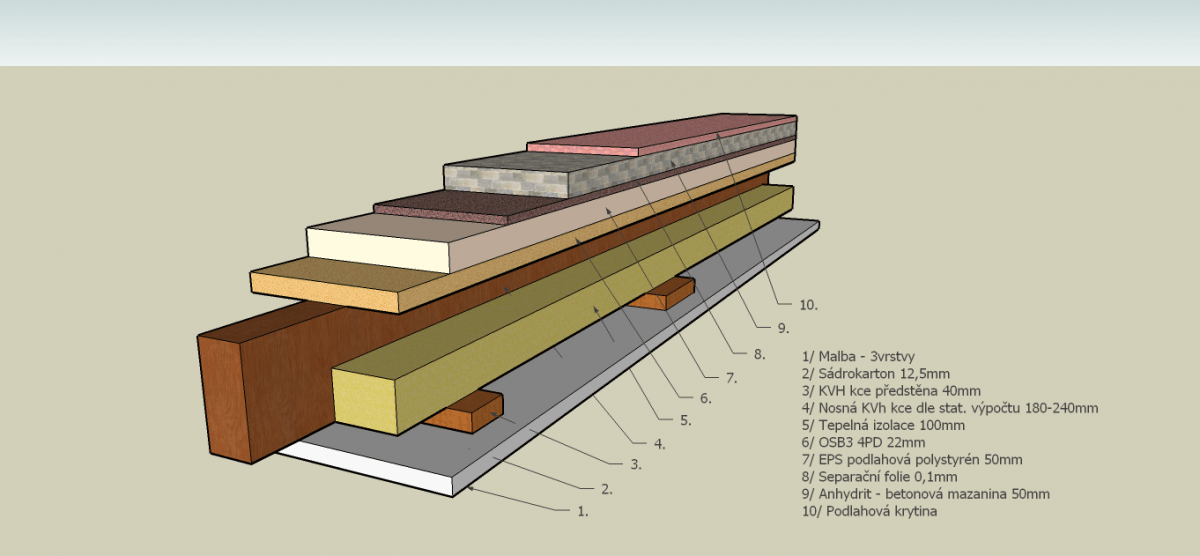 Stropní konstrukce je tvořena konstrukčním KVH dřevěným roštem do kterého je vkládána tepelná izolace. Na horní část roštu se pokládají konstrukční OSB desky zajišťující rovnoměrné zatížení. V další vrstvě je pak položen podlahový polystyrén EPS, separační folie na které je posléze vytvořena vyrovnávací anhydritová nebo betonová vrstva podlahy. Poté je možné realizovat jakoukoliv podlahovou krytinu dle požadavku. Na spodní část roštu je upevněna dřevěná KVH konstrukce podhledu na který je upevněn protipožární sádrokarton nebo Fermacell.