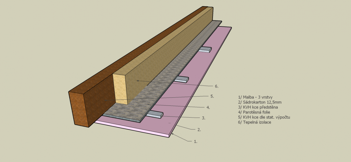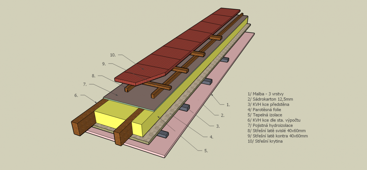 Střešní konstrukce je tvořena konstrukčními dřevěnými KVH hranoly nebo sbíjenými vazníky. Z vnější strany na trámy je instalována difuzní folie, svislé laťování s kontralaťemi na které je pokládána střešní krytina. Mezi trámy je vložena tepelná izolace. Ze spodní části střešní konstrukce je paronepropustná folie na které je realizována KVH dřevěná konstrukce podhledu na který je upevněn protipožární sádrokarton nebo Fermacell.